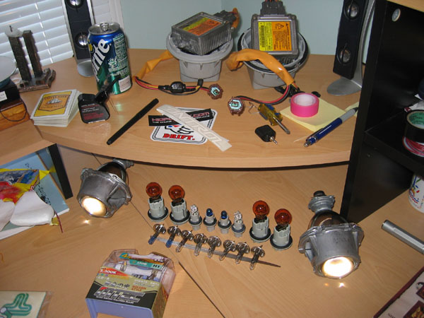 i'm getting really lazy. finally fabbed my own d2s bulb clip for the h7 valeos. what a pain in the ***. oh yeah, look at how many h1 bulbs i have! i have 2 more coming in sometime next week i think. 2 yellow mtec's from impulse. then i'm going to my shop, use their heatgun to open the tyc's, install everything, close the tyc's back up, and then put them in my room again. still looking for ballasts.