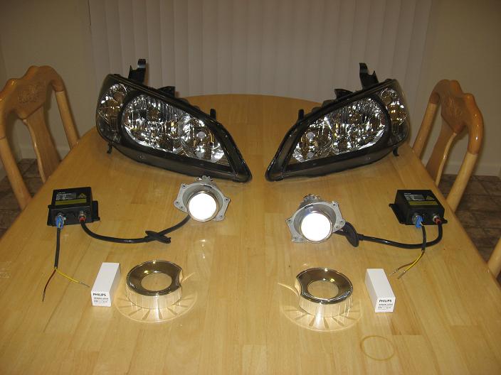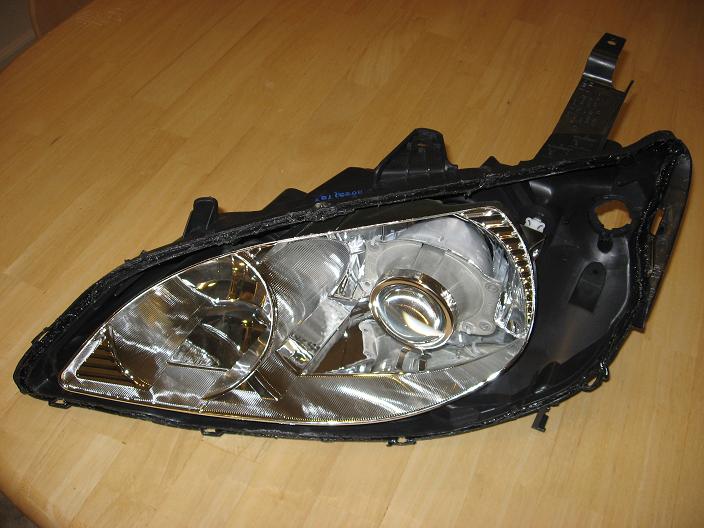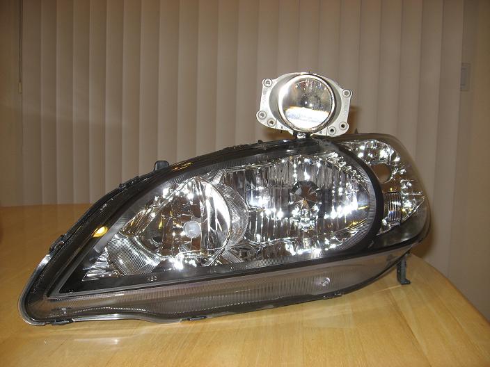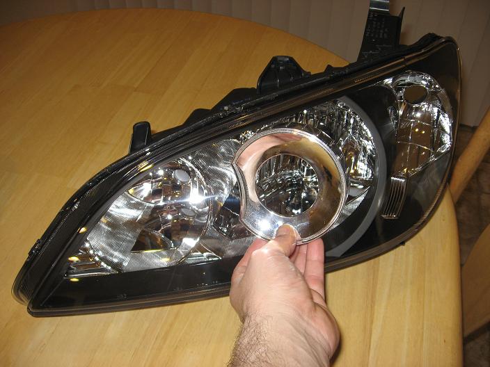I'm getting ready to retro a pair of TSX Projectors in some 04-05 headlight assemblys. I'm thinking of using the Audi A4 Bezels. I found a place that can make a custom piece to fit the bezel and cap the lowbeam section of the headlight assembly to hide the TSX projector. This custom part will be painted black to match the rest of the headlight assembly.