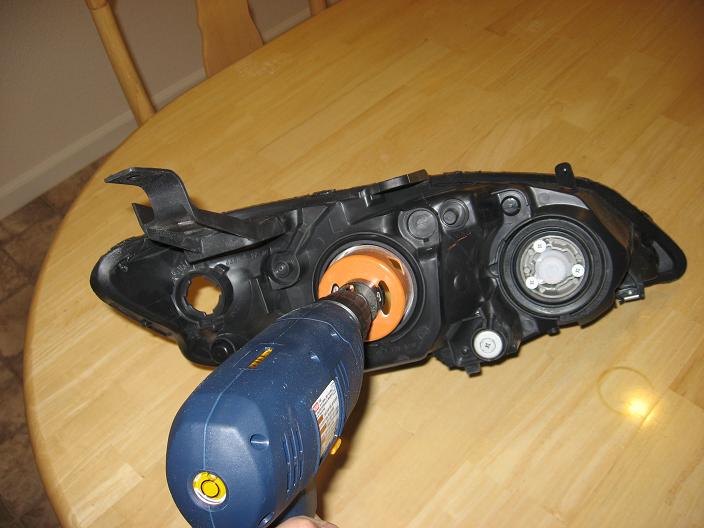 -Used a 2 3/4 inch drill bit to drill out center of the reflector. 3 inch bit was a little too big to fit the outer section of the headlight assembly. The 2 3/4 was a little smaller but not much. It was pretty easy to have the hole centered.