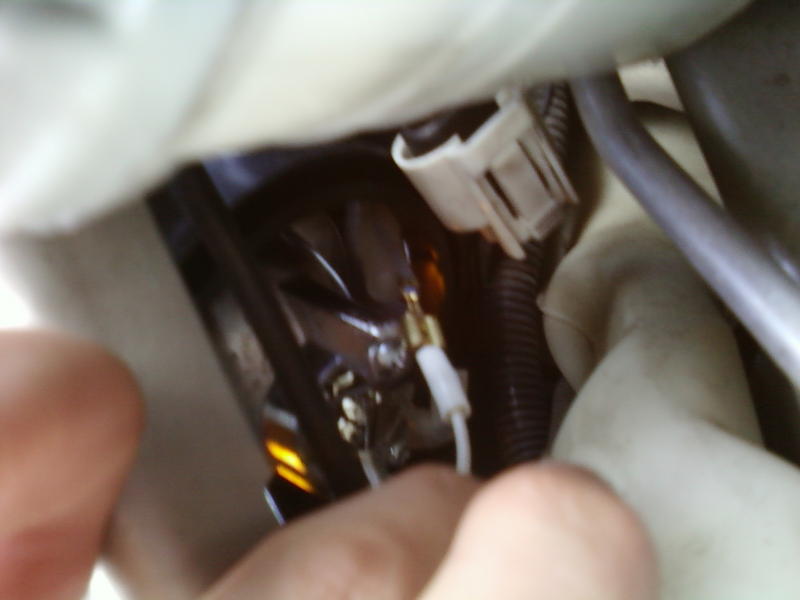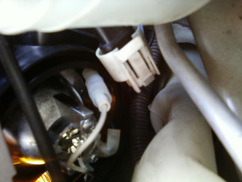 the stock halogen bulb connects by a white wire with a spade looking thing and and there is a black wire in the background covered by a rubber sleeve, im thinking that its the ground....