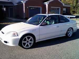 Anyways, lol I just bought my 2000 Civic EX. She is white with white rims. Has a intake and exhaust set up. As well as racing front seats, 4 point harrness, system, and a wing and vented fenders. I have purchased a set of drop springs but need to sell system before inistalling per system is weighing the back end down. She has 88,000 on new engine and 120,000 on the body.