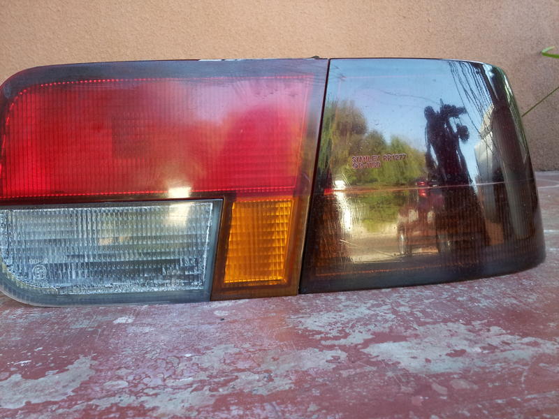 Back on subject, this car has 3 different shade of black, stock with nice flakes, primer, and spray paint. The bumper is held up by these huge hinges, which the PO decided drill through the fenders to put in. I spent the whole day today peeling off carbon fiber tape, scraping off spray painted tail lights, spray painted windshield sun visor type jump, ripping out switches and gauges that werent even wired up. Attempting to realigning body parts, and sourcing OEM parts.