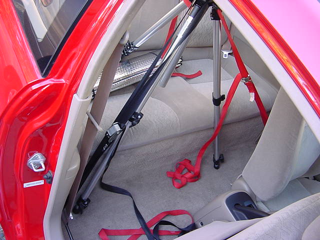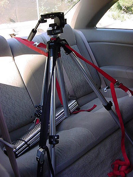 So, I have a coupe and we have some funky lower seat belt stays. I've attached a picture of a time when I had it halfway taken off to remove a panel (note- you do not need to unbolt these!!). I took some tie downs that you'd find in most automotive stores to tie stuff down to your roof racks or truck bed, the kind with the clamp. I strung two around the bottom seat belt stays and over the tripod head. These are like giant belts that pull the tripod to the left, and to the right. Then my only issue was it rocking forward and backward. So, you know those red child seat hooks on the rear deck? Yeah, time to use those puppies. I laced another tie down through one of those and around the tripod head to pull it back. I made some more adjustments to where the camera position would be-- so it would catch all the action, and not a whole lot of my roof, or a whole lot of my dash and floor. If I remember correctly, I slid my seat somewhat forward and then reclined it to get the seat out of the way, and also to hold it in there just a tad more---not like it needed it- because when I was standing outside and shook the tripod- the entire car shook- there was absolutely NO play. So it was in there and ready to go, although it was night time, damn.
