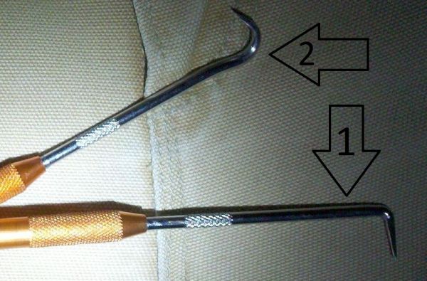 First I pushed hook #1 into the above gap, the straight tool forced the small gold clip outwards. Then I used #2 to reach under the gray metal and hook onto the clip. Once hooked I pulled straight out and removed the clip easily: