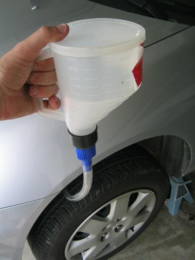 Step 5: Have a person stand next to your car and hold the funnel as seen below.