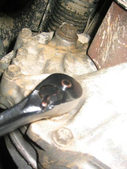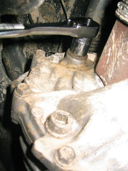 Step 3: Place the wrench (without any socket attachments) into bolt #2. As you can see, bolt #2 has a hole in it that fits your wrench perfectly. Unscrew the bolt by turning couter-clockwise. Have a small bucket to catch all the manual transmission fluid about to pour out of where socket #2 is located. Once all the fluid has been drained tighten bolt #2 back on to the transmission.