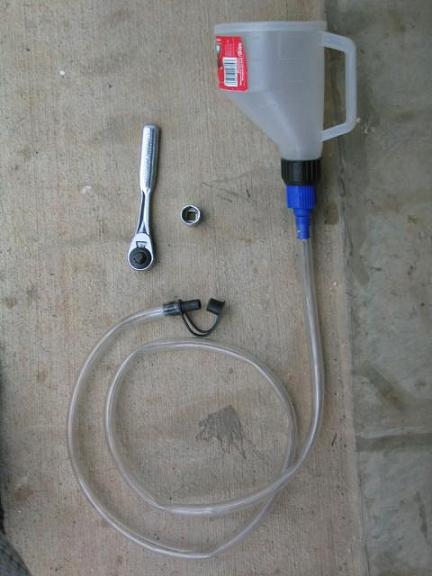 Step 1: Once the front of your car is up on the two jack stands, get out your funnel, wrench, and 17mm socket.