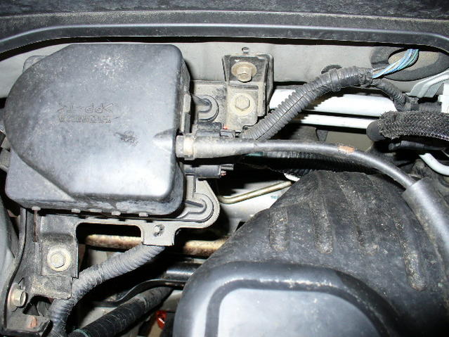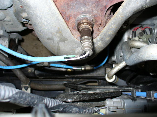 Photograph 916 gives you an overall view of one of the damaged wires. Photograph 918 gives you the close-up view. Note that the damaged wire is actually the one with black insulation--this wire is one of the wires in the thick cable with green or blue-green insulation. I know that this cable is a part of the upstream oxygen sensor.