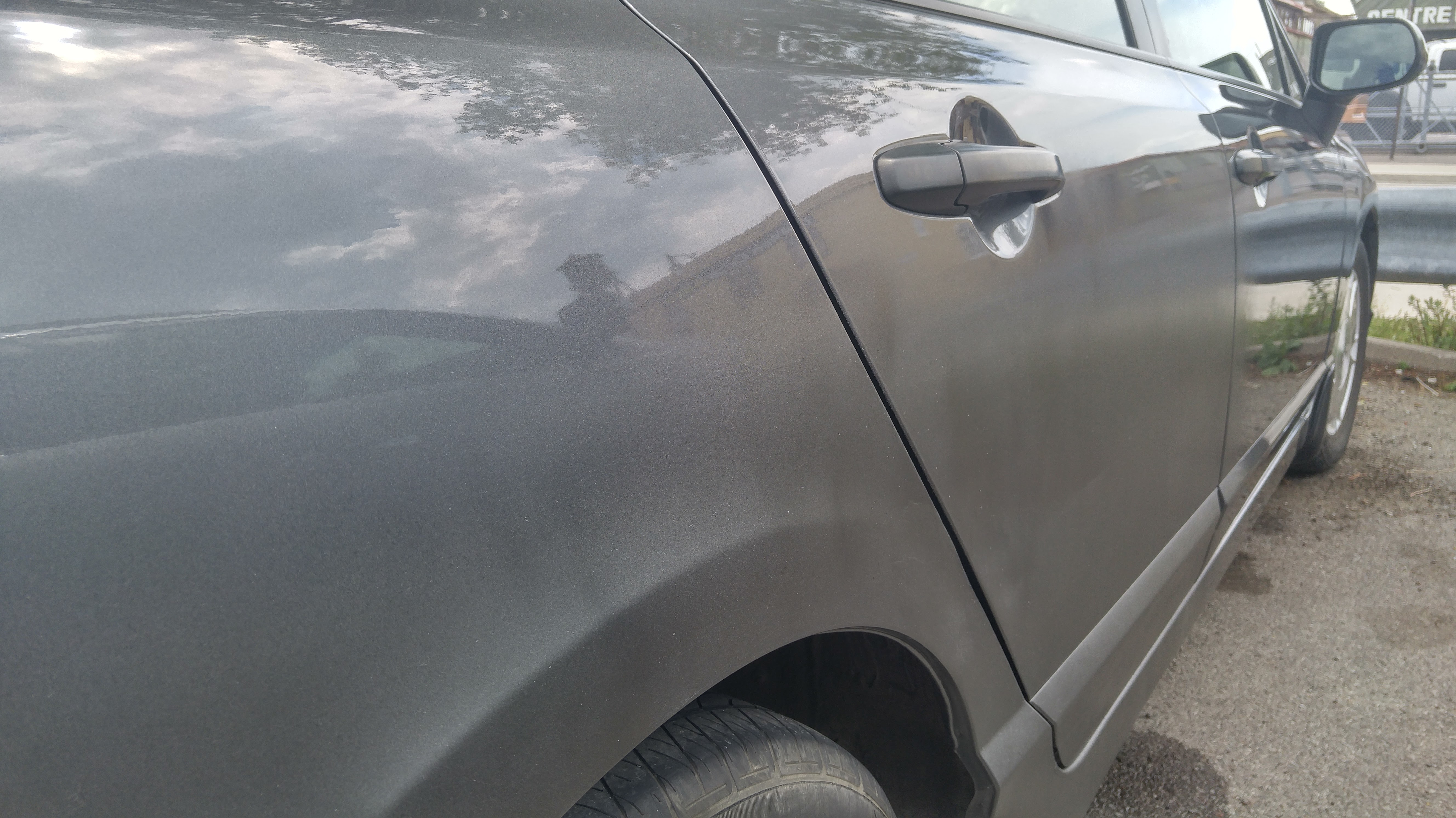 Check out these images. I wanted to do a self repair for a scratch on the rear door. After applying the primer spray, I used the paint spray for the same color code, and then a clear coat spray. The result went unespectedly dissapointing, since the final color and finished texture were by far equal to the original.