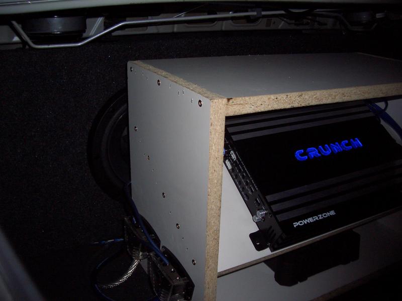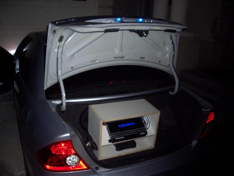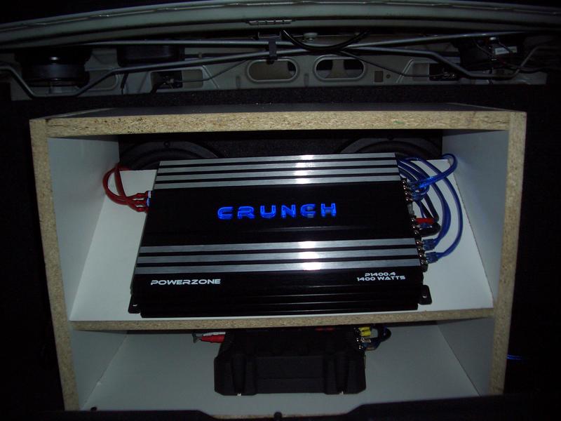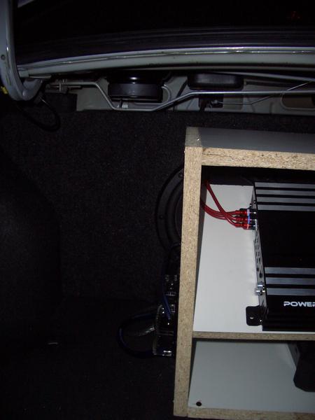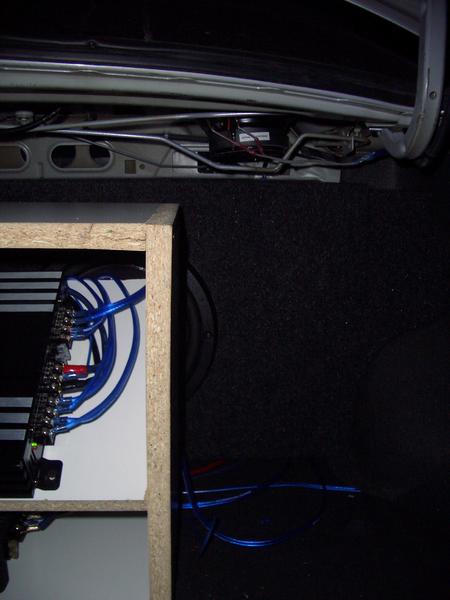 my only suggestion would be mount the bottom amp on the rear seat and take the rack out and mount the top amp on the floor of the trunk cause i know that your going for the blue lights but it does look kinda cluttered and you cant really see your subs too well.