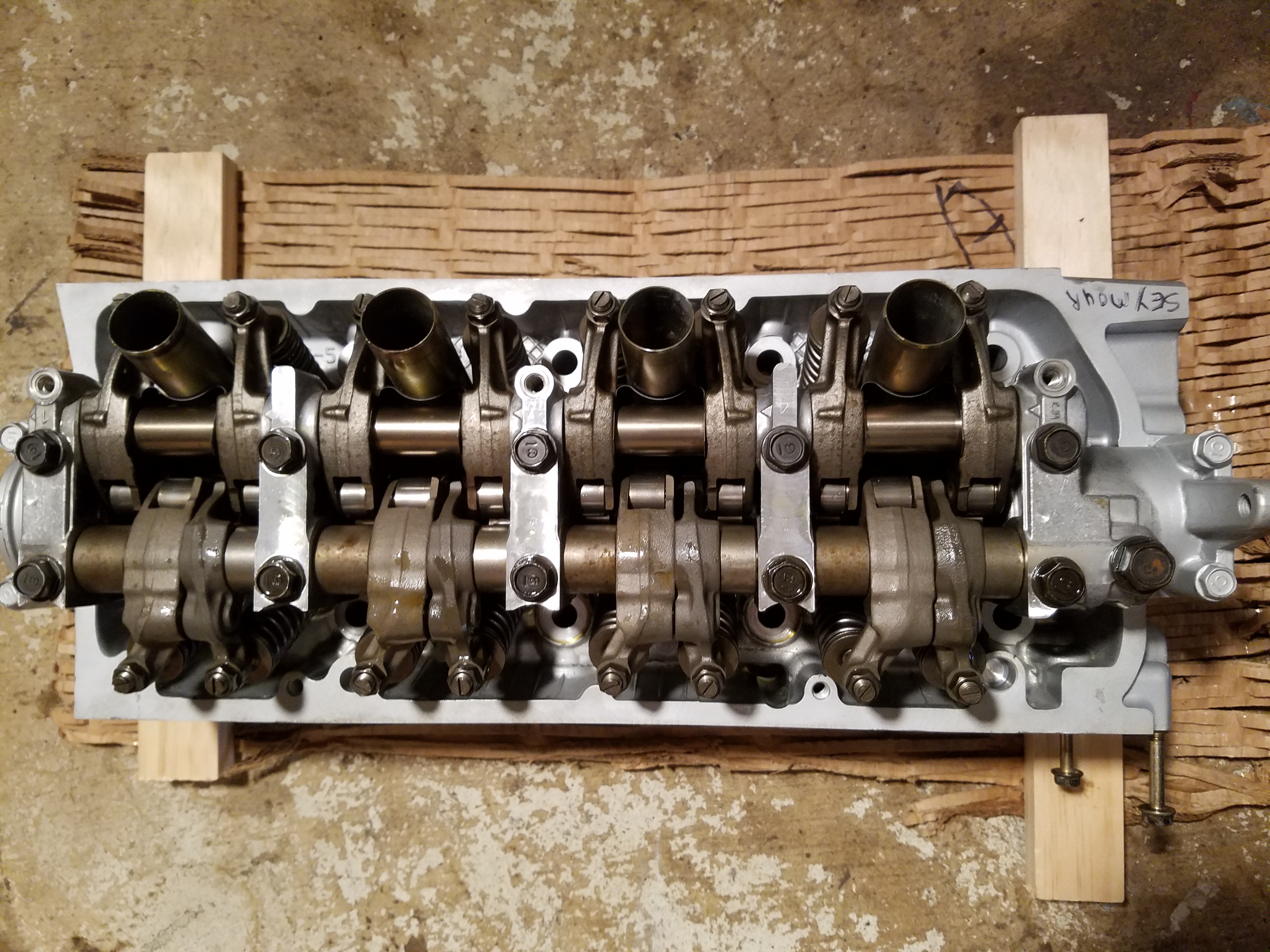 The head is now coming off again due to a misfire in #3, traced to bad exhaust valves on that cylinder via an improvised leak down test.