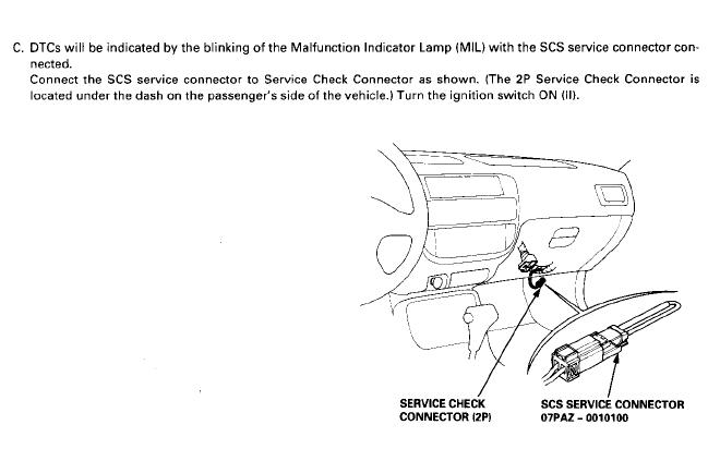 Locate the SCS connector behind the passenger kick panel. Then jumper the 2 pins in the connector using a paper clip (or any other suitable metal conductor) instead of the special Honda tool. The turn on your ignition to position II and count the long and short blinks of the Check Engine Light to get the 2 digit Diagnotic Trouble Code.