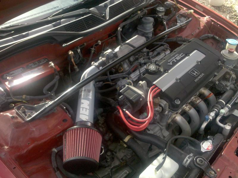 engine- stock b16a2 aem intake greedy headers stock exaust pipe greedy muffler with 8.5mm magstar racing sparkplug wires and bosch platinum 4 spark plugs