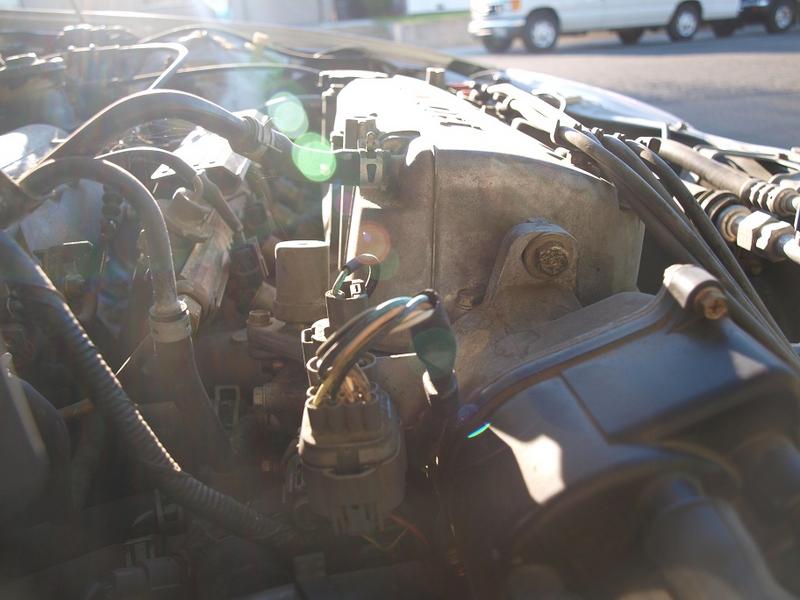 Look for the vtec solenoid. It's the rusty looking cylinder near the top of the pic. Those thick grey wires are distributer wires.