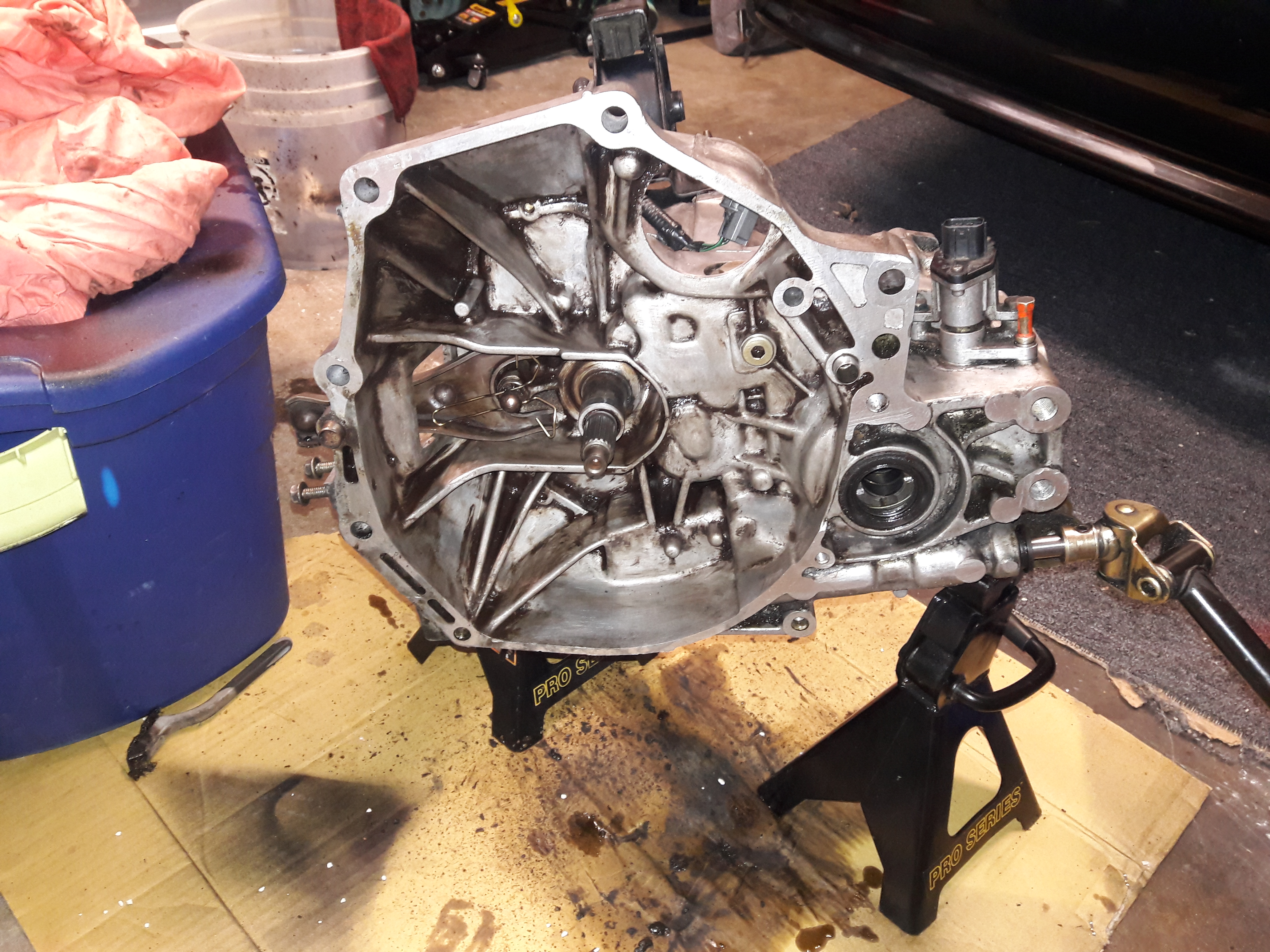 So here is what I have sitting in my garage from october. had planned on a z6 head with 5 speed swap from a 95 si..sold the head and left the tranny in the corner.. Took a look at it today googled the numbers on it wiped it down etc. Can anyone tell me anything else about this transmission..yes i know its missing throwout bearing etc etc. but money wise would this 5 speed bolt directly to a y7 bottom? Of course with some modification i would think it could? As it stands right now I'm toying with the idea of ordering a rebuilt z6 head, check the block/ new internals maybe and call it good..Need any input or something...Its one of those days where I have no idea what i want with this car anymore haha. some pictures of transmission below: