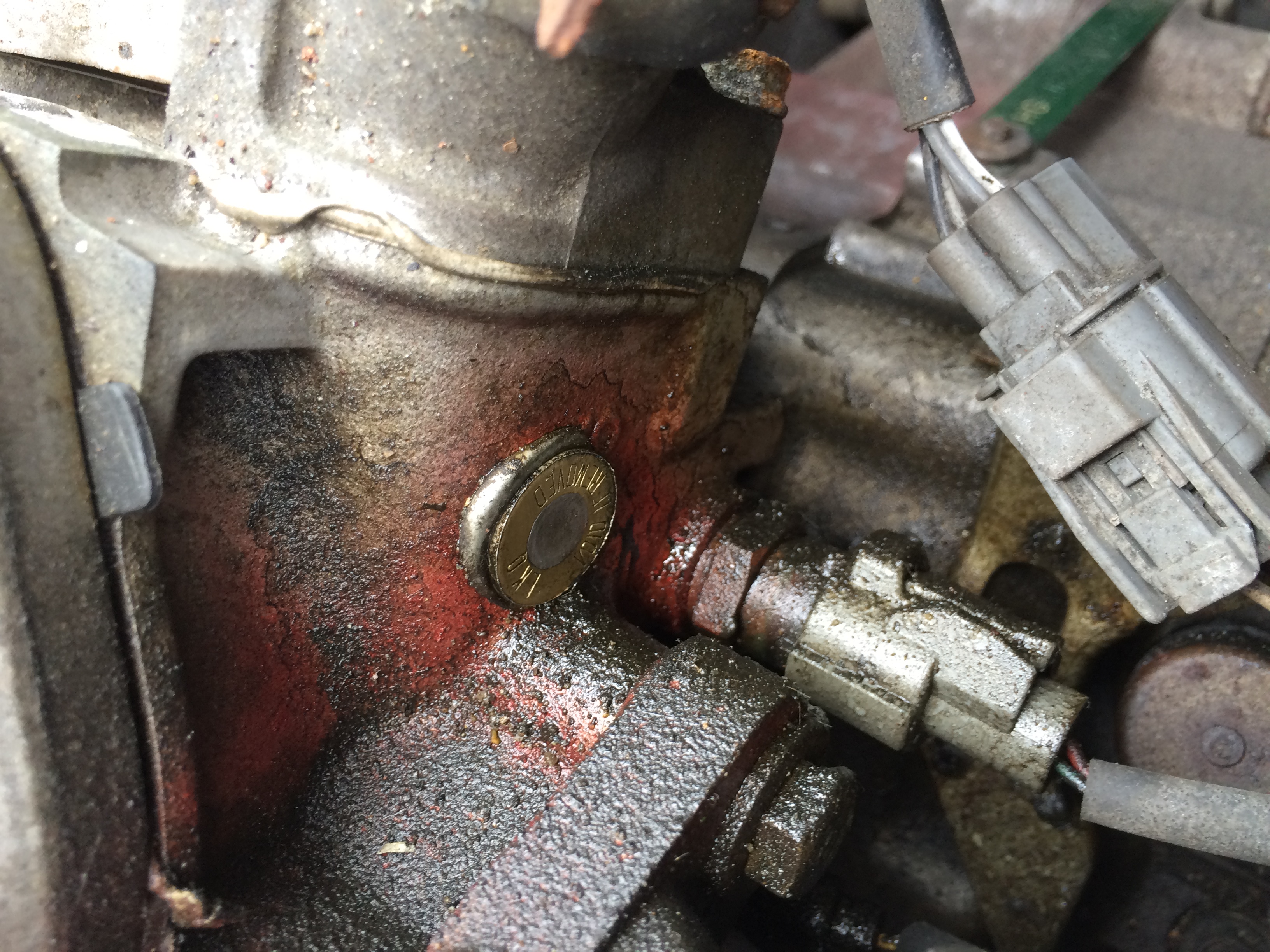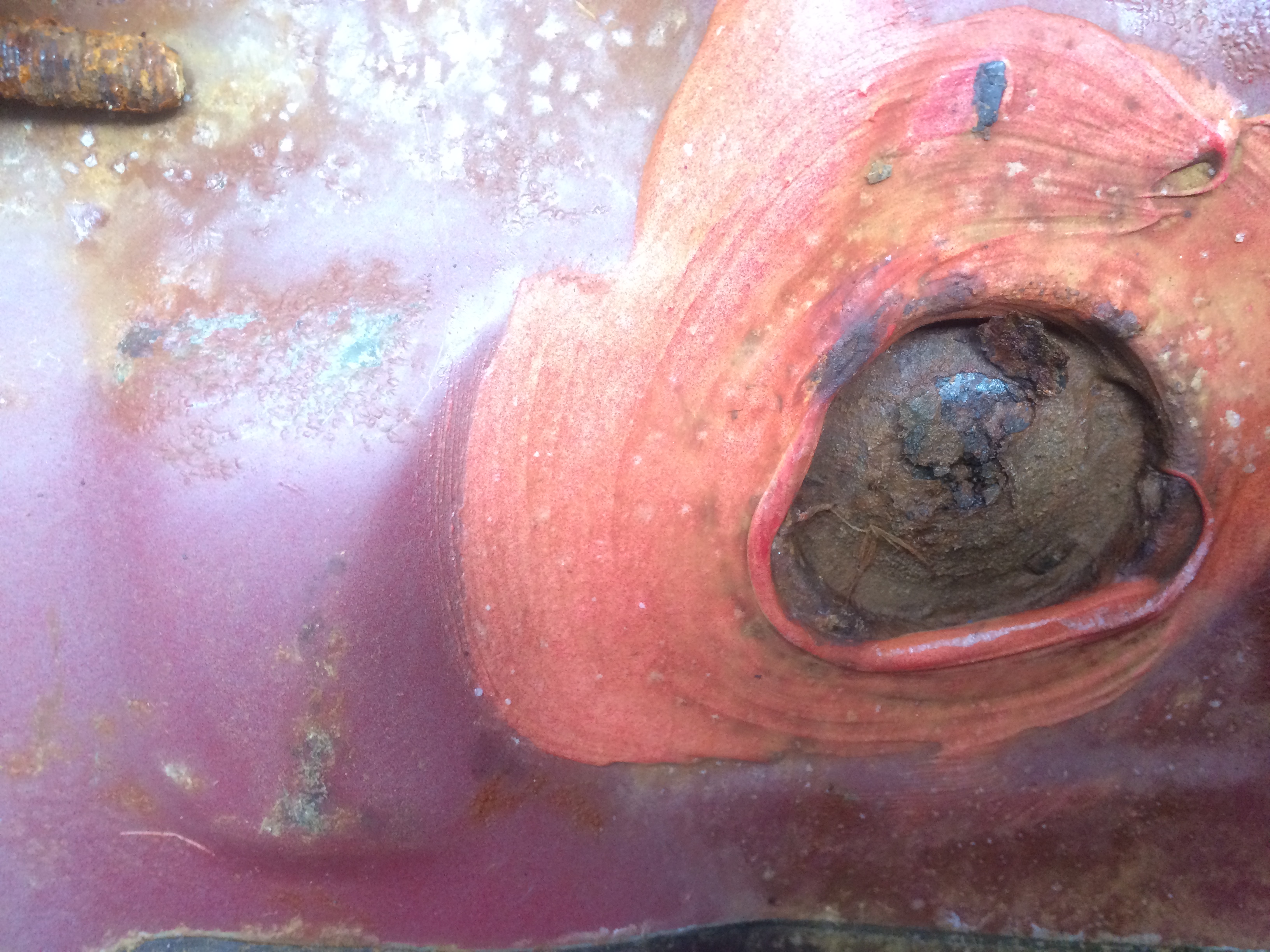 The sealer one is like "RTV" or like a paste that was smeared. The circle with rust is like a cap. I did a "screwdriver" test. Barely tapping on it almost went through. The color difference is no big deal, its covered by the cardboard sheet (albeit alittle deformed) and the carpet. I just thought it was really odd lol