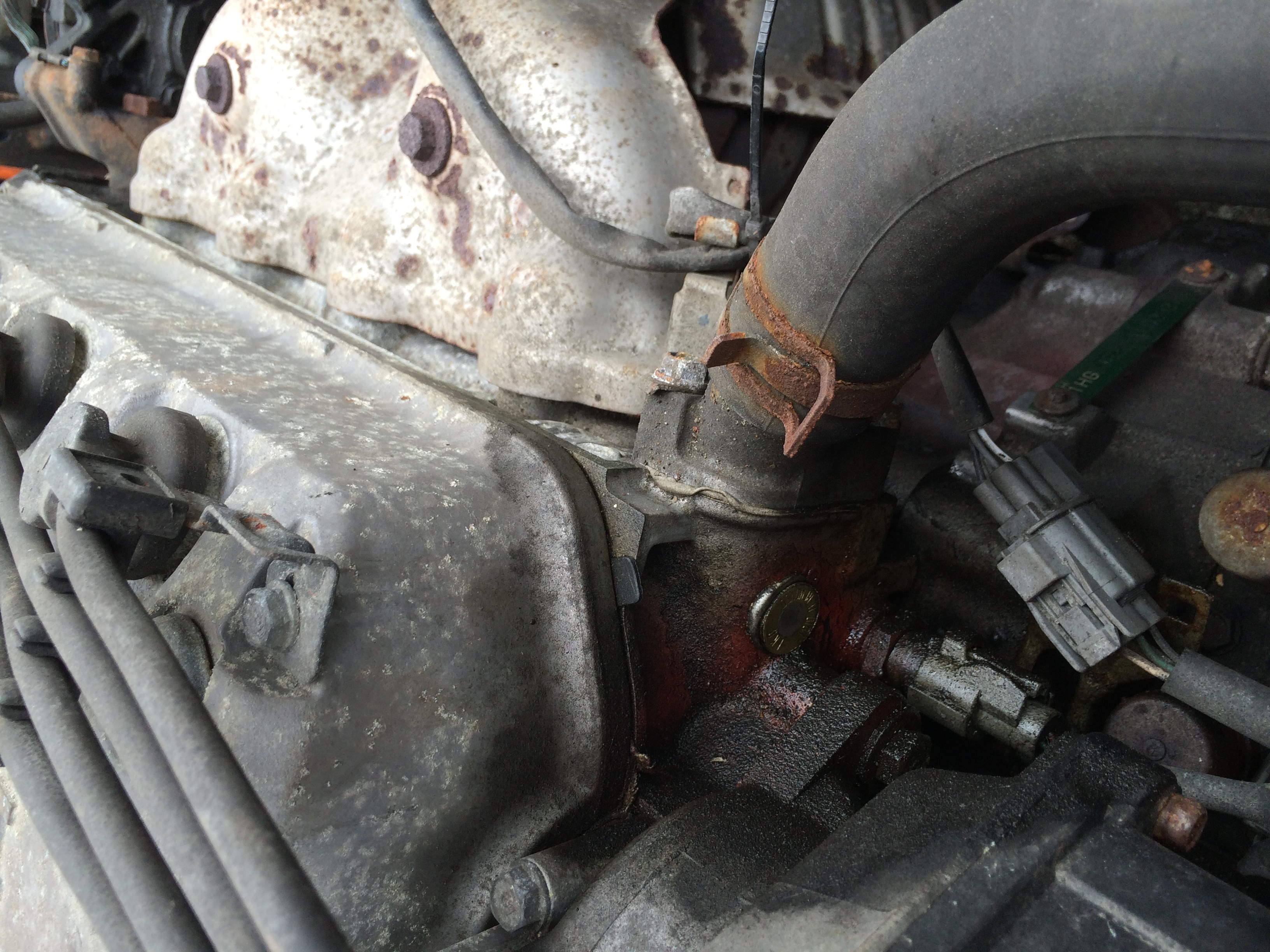 And it's a leaker. Looks like all the usual high mileage oil leaks, and that heater hose under the distributor is wet with oil, that's a bad bad thing for the rubber. Fix leaks, replace hose. Oil leaks are usually all of the rubber gaskets needing replaced as they get old and brittle with heat and time. .
