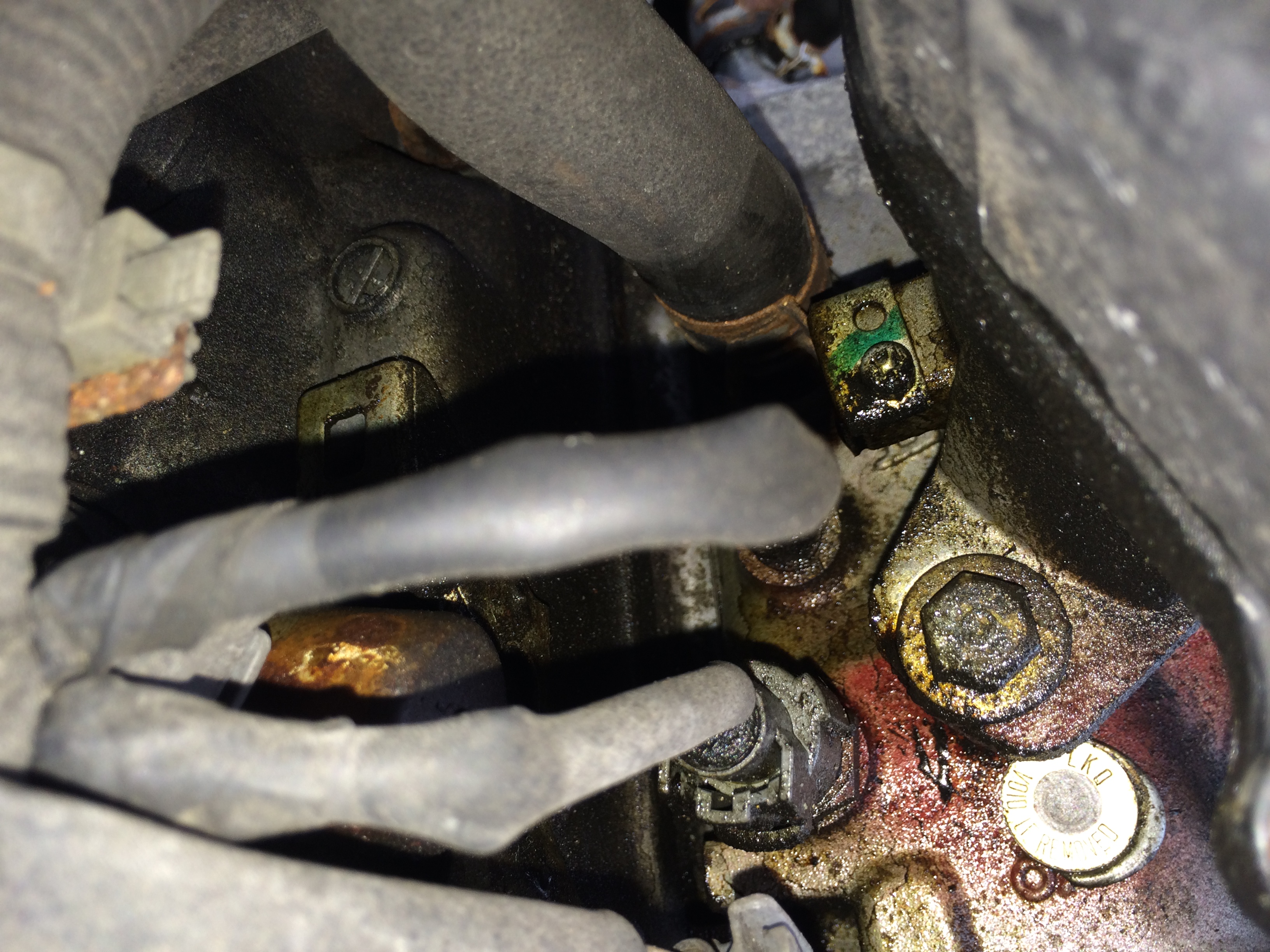 First and foremost- my cylinder head has a LKQ plug (#1344)... so I have a reman'd head - no mention of this from previous owner(typical) or carfax. The plug has a bit of fluid around it and has given the area a light coat (#1348) (#1355) (#1356). Upon further investigation I revealed that engine serial is not the one my car was born with. SOO... "new engine, new cylinder head" maybe new internals? I'm gonna go out on a limb here and say the yellow Gates timing belt tag on the fender would be the best estimate of when this EJ got a heart transplant.