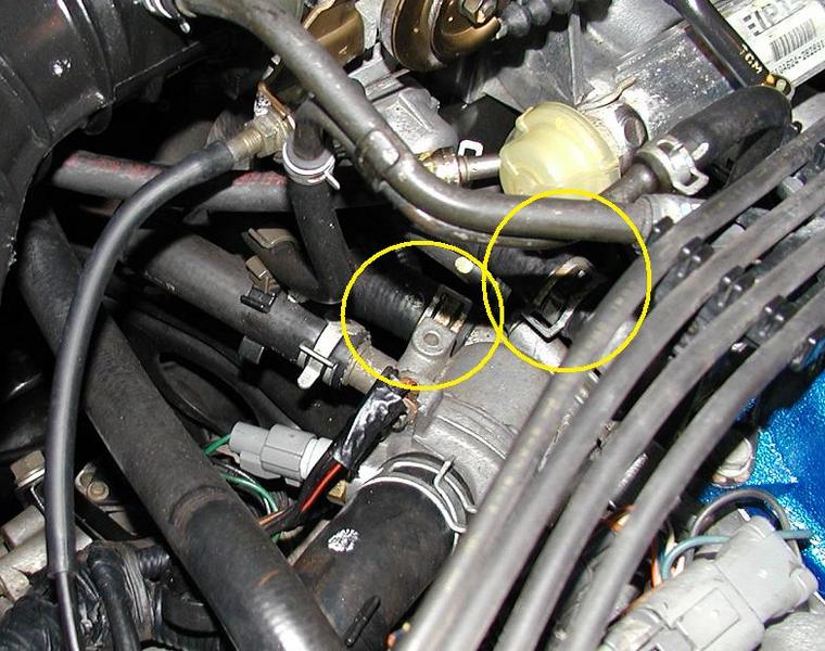 The hose in the first pic which comes from the intake goes right back to the water outlet below it. Both circled in yellow.