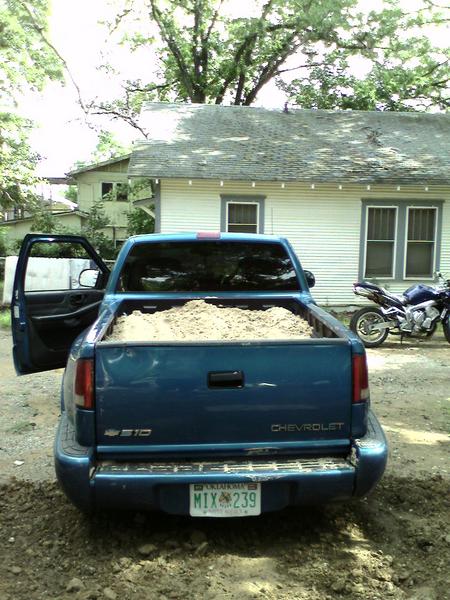 Well I took the truck yesterday to get a Yard of sand. The dude told me that all my S10 could hold was a 1/2 Yard so we filled the bed up to the top, only cost $10.00, and I was off. Got home and shoveld and leveled and shoveled and raked. It is now level and I am chillin. Here are some pics of the truck with the sand. LOL