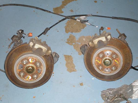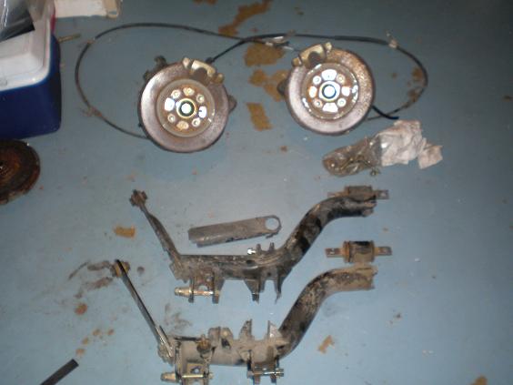 This was a very hard item to find I ended up getting the brakes from an 02 Si with less than 50K on it. They were shipped all the way to Ohio from Oregon. When buying them I specified that they had to be 4 lug (for those that don't know the newer models 04 and 05 civic Si had 5 lug brakes) and I needed everything including the e-brake cables and any hardware. Well, as you can tell from the pics I got everything and much much more LOL. I will not use half of the stuff that I got, but it is always good to have extra parts laying around. What I don't use (the entire lower control/rear tie assembly) will be sold on ebay.