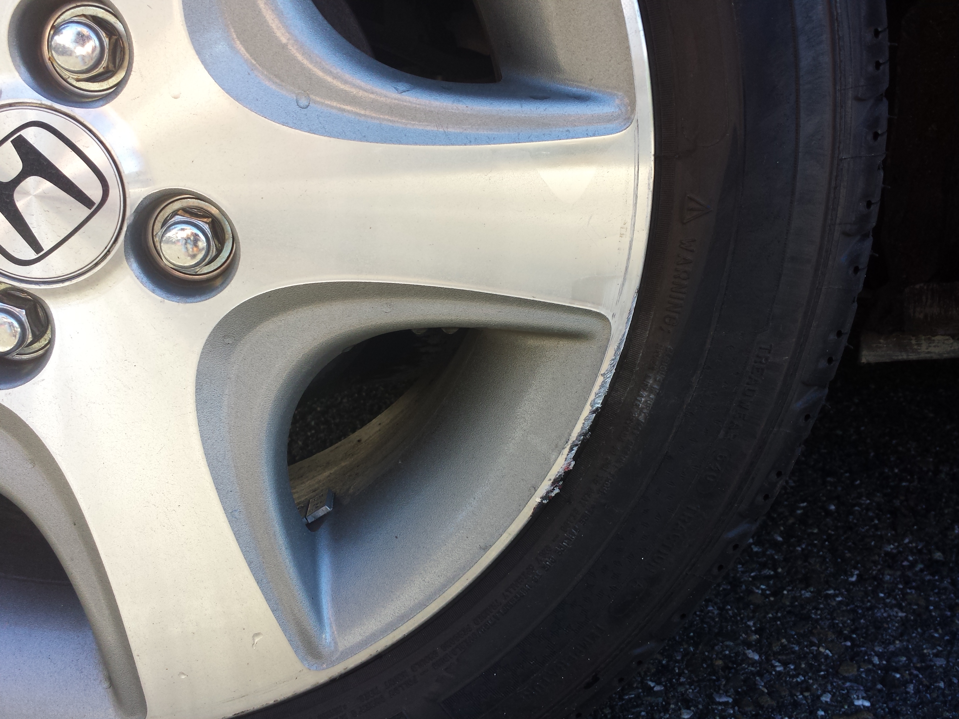 A few days ago I made a very slow turn while going through a shopping mall and hit the sidewalk curb which resulted in damaging part of the wheel with lesser damage on the tire. I have monitored it for several days and the tire does not seem to be losing air.