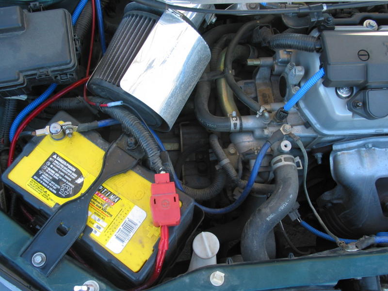 i can't see behind the battery, but it looks as though you still have the stock cable on there. where the battery cable runs left in this pic, follow that down to the chassis just under the relay box. that's the main battery to chassis cable. that's the one you want to be at least 4ga, if not 2ga or 0ga depending on how big you make your system later on. with the stock setup, this cable is crimped into a bracket and then continues down and right to the tranny. that is the third cable in the big 3. i don't have my camera until tomorrow or i'd take pics of mine to show you.