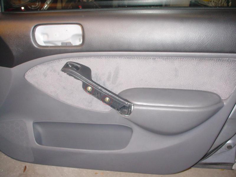 3). Remove those two (2) screws and the pull handle assembly should easily pull out. Carefull! Note which door that you are modifying: drivers side or passenger side. The drivers side not only has the door release linkage rod but a power lock plug. Remove the plug first, if equiped, then push off the clip on the linkage rod. Carefull not to break it.