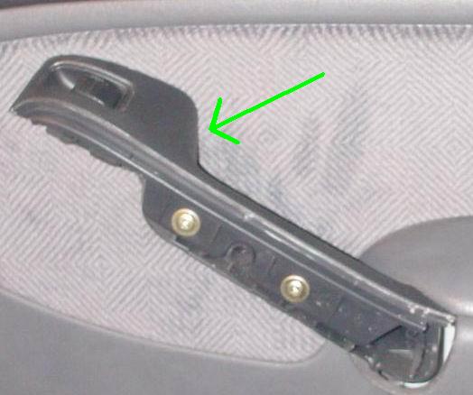 5). This part I found difficult. You have to remove the front cover on the door handle. I found the best way to remove this is to start at the bottom of the handle. Then insert you prying device into a seam behind the power window switch. If you cannot find this location, follow the seam all the way around untill you at the actual door panel behind the power window switch.