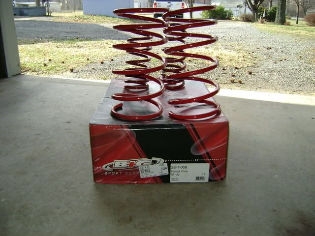 First i have a set of B&G Lowereing springs for 01-05 civic that are in great condition. I dont know how many miles are on them cause they where on my car when I bought it. But i can tell u they were on blown oem struts and still rode great There rated at a 1.5 drop and DO NOT sag at all. Im asking 85 shipped for them and SPC front camber bolts anywhere in the US. plus shipping. Also the only reason that im selling them is i just installed my D2 full coilovers this weekend so i no longer need these. Heres some pics...