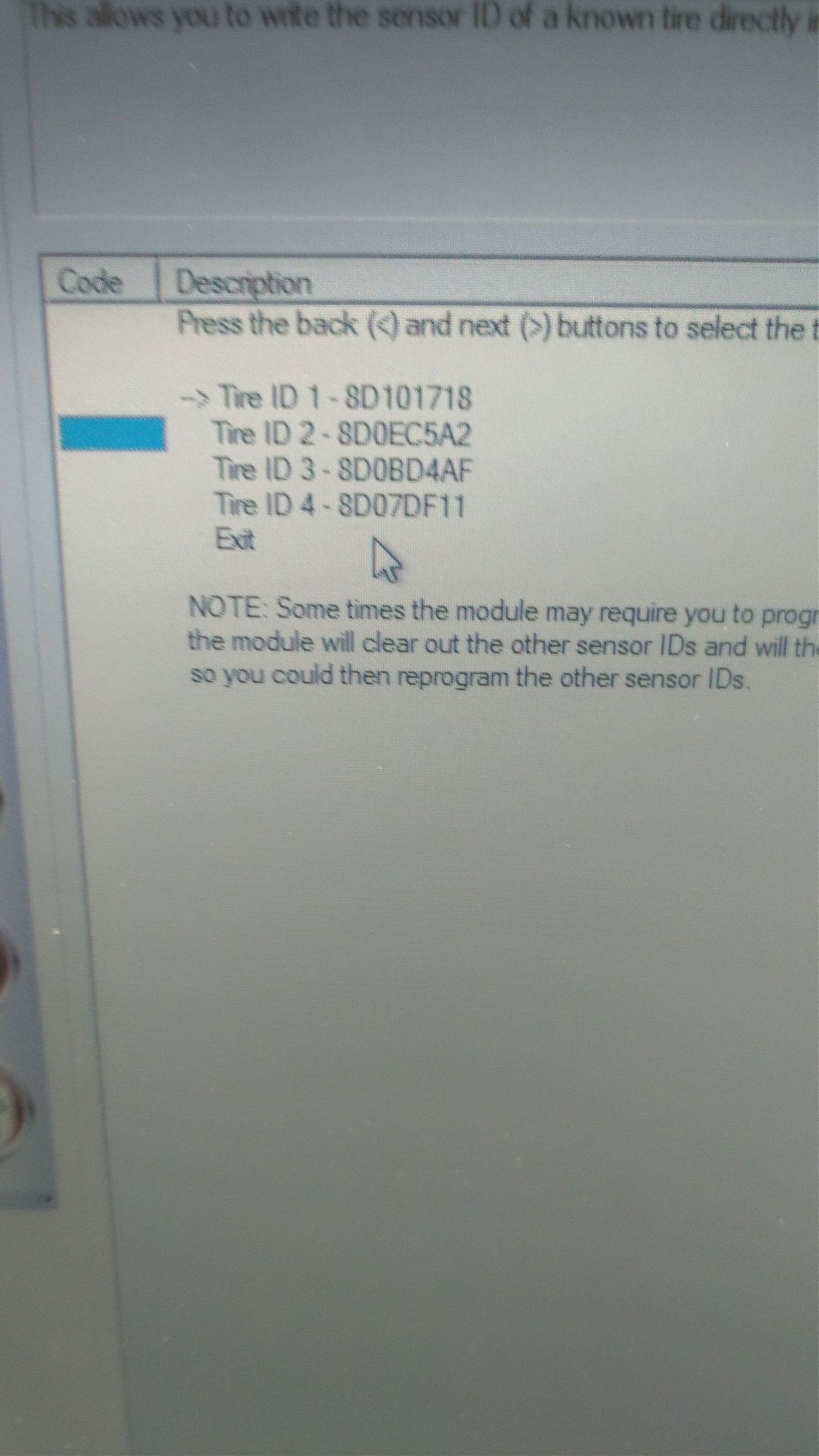 After you put ID numbers in, you have to turn the key to ON position and bleed the tires to 8 PSI and reinflate them to 32 PSI or whatever spec you use..