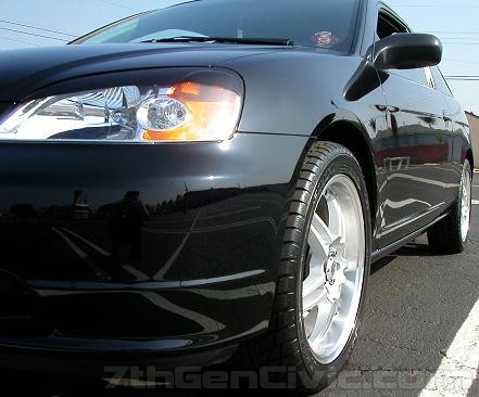 But either way, to answer your question those eyelids on my car are just vinyl that I had left over from my visor. In order to shape them to the curves of the headlight it takes a heatgun and a little patience. first, cut the shape you want, wet the headlight, peel the vinyl, wet both sides of it, place it on the headlight and as you pull evenly, push out any air bubbles with a credit card...you can use a library card if you don't have credit..=} and then using the heat gun and still pulling on the outer edges of them, you'll see that the vinyl will start to 'give a little and you can lay it right over the bump of the turn signal light. then just bend it over the edges, cut off the excess and wipe the headlight dry.