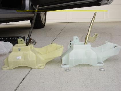 Its not the shortness of the stick, its the distance of the hanger for the shifter cable. You can see in the picture that the piece that comes out from the shifter is higher that the stock, thus the shorter shifting distance.
