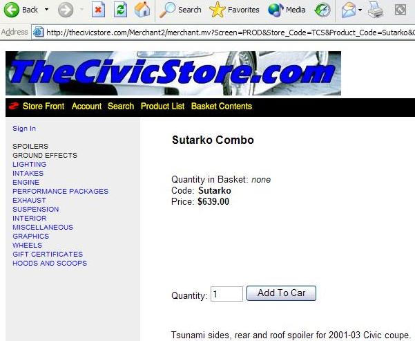 Tsunami front looks good but the rear would look better if it was lower. The tsunami wing kicks *** but so does the mini-me spoiler that is on Espec's ride. Go to www.bigboosting.com and click on the body kit selector to mix and match a kit on a 2001 civic coupe to see what you like. It's still in development but is done in a way that is completely awesome. Check out the site too and sign up for the boards, there's not to many civic people there now but hopefully the site will grow. ALso check out the option of getting a board for your local car club.