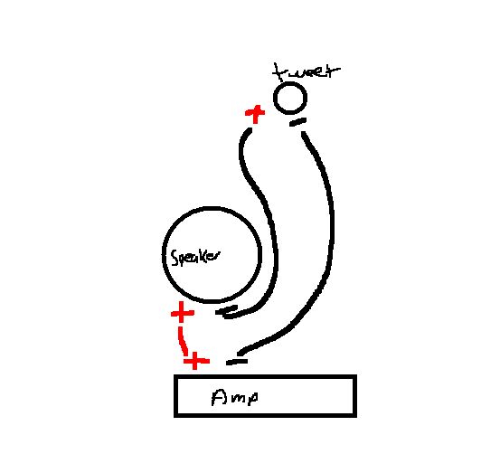 Since I am bad with xovers I forget how xovers connect, but I believe you will have a + and - in for the signal and + and - out to your tweeter. Just substitue one of the speakers in that diagram for your xover and run the + and - to the + and - on the crossover and then go from + and - on there to + and - on the tweeter keeping the same polarity