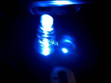That's gonna take forever. Let's say you want one blue led. You go to radioshack get a 2600mcd led with a forward voltage of 4v. I used a 560ohm resistor wired in, but I think you could go lower like 460 or something and still be fine. Too much resistance will dim the light output, too little will make it burn out faster.