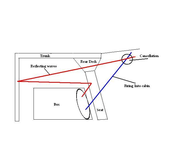 You know, I've been thinking about this. I think that you do in fact need to make the enclosure's front baffle the same angle as the baffle you are firing through into the cabin. Otherwise, you will get sound waves reflecting off the baffle back off the trunk lid and cancelling as they come into the cabin. perfectly sealing off the cabin and the right angle would eliminate this. Just a thought.