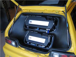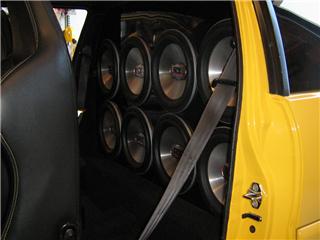 installed new JVC Arsenal KD-AR760 with 4000 watt amp with 2 2000 12'' in a bandpass box. and secondery 1000 watt amp powering 2 12" subs in a open air box. then the 6.5s in the front doors and the 6x9s in the rear deck are after market as well.to power that i hade to use 3 car batts. and 2 caps to handle the power