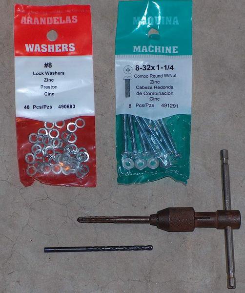 Here's the tap, drill bit, screws and washers you can pick up at Lowe's.