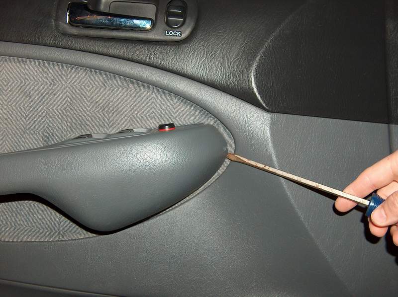 Insert screwdriver as shown here or anywhere around the door panel edge and pry up just enough to get your fingers behind the panel. There should be around 5-6 fasteners that will pop off. The panel the slides straight up out of the window channel.