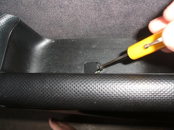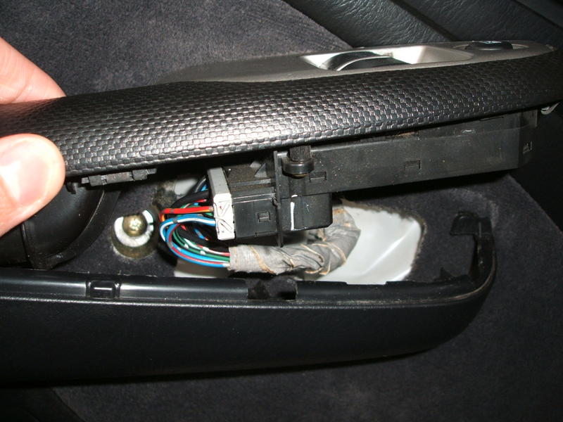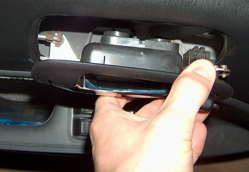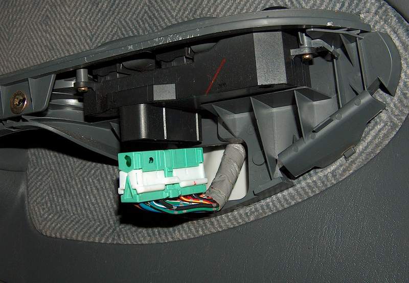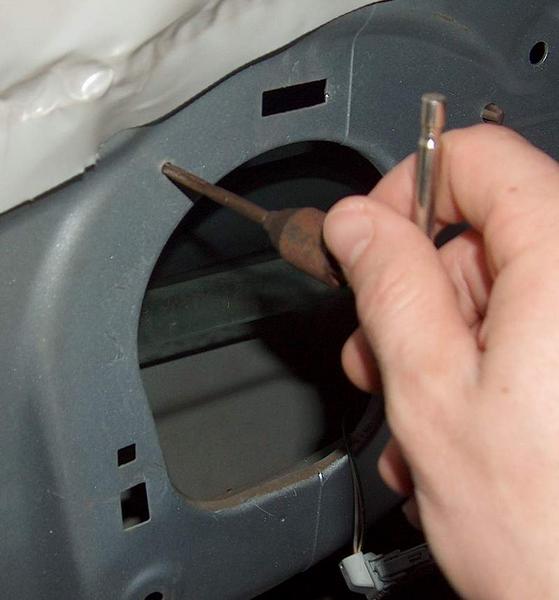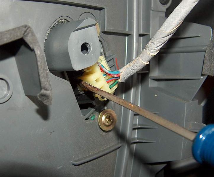 At this point, I turned my car on to make sure that the speaker was working. Once you're satisfied, reinstall the door panel the opposite of how you removed it. The passenger side is essentiall the same with one exception. Removing the electrical connector for the power window has to be done from the back of the panel. Insert the skinny screwdriver as shown to release the locking clip.