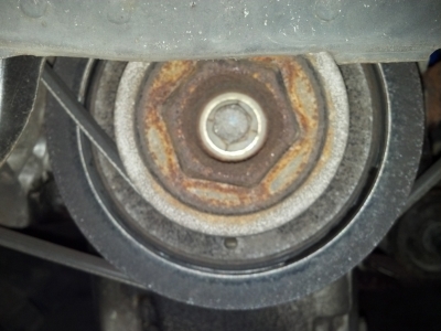 I grabbed the pulley, and started wiggling it back and forth to see if I could get any play in it. I couldn't detect much at all...but there was a little. However, it seemed to be around a rubber ring between the outer pulley and the center plate....as if there is a rubber buffer between the two.