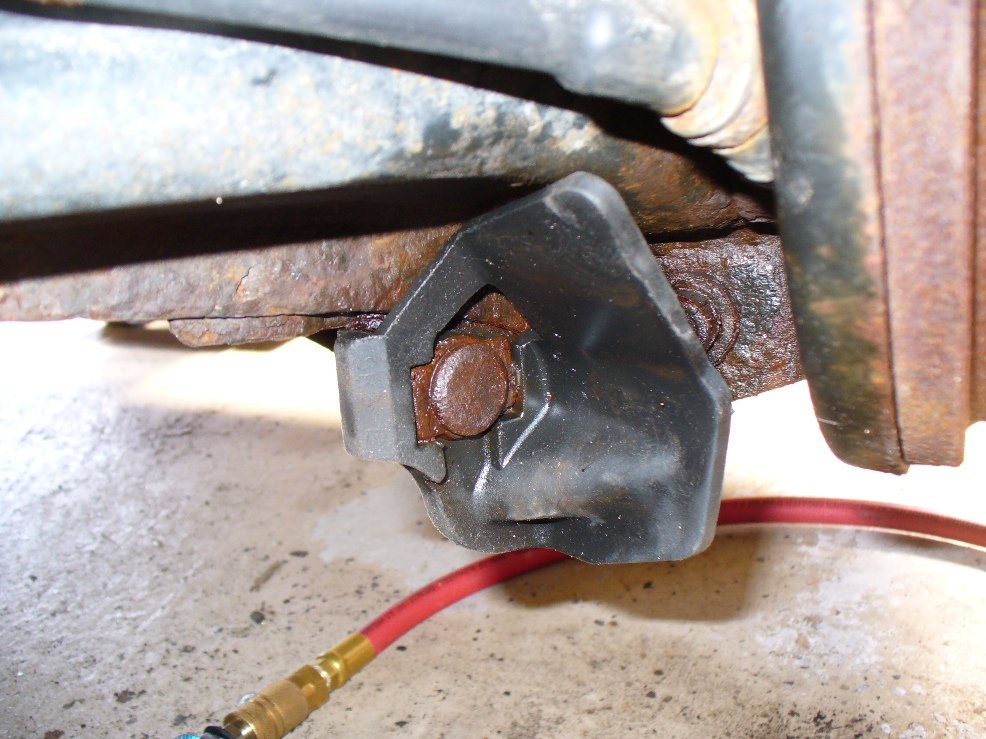 On to the driver's side. Different story here. The bolt through the bottom of the strut is cracked loose from the nut, I can feel the end of the bolt turning where it goes through the welded nut. BUT, it appears to be seized to the bushing there. Hmmm leave that one for the time being.