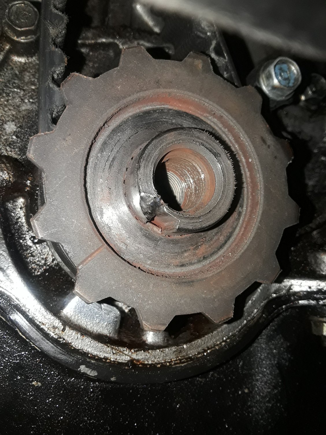 I had a mechanic scam me and this is the result friend of mine says he can replace the crankshaft for 150 not including the new cs but does it need replaced? No experience with this part of the car but the pulley bolt won't tighten down because the cs is chipped where that notch is so is it ruined or is there a fix?