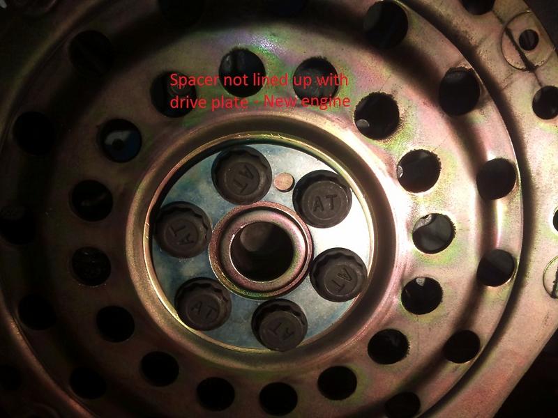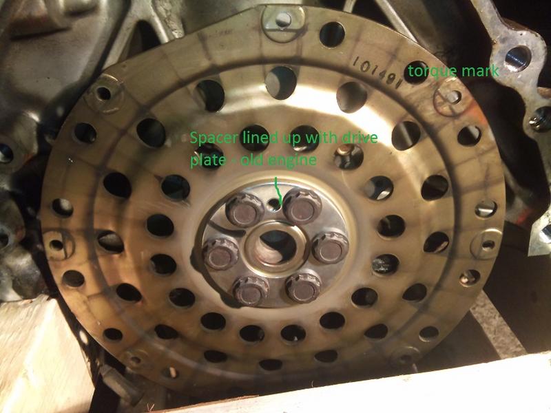 hi there, my friend and I are replacing the stock engine in a 92 civic. this is our first swap. we have so far removed the engine and tranny from the car. we marked the drive plate and the torque converter as per all the instructions we have read. my question is how do i know where to line up the drive plate on the new engine. i have noticed a reference point on the drive plate however it is slightly different on the new engine. there is a spacer plater between the six bolts on the drive plate, an there is a hole punched in it. it looks like a reference point, however the one on the new engine is not lined up (see pics). do i need to remove the bolts, move the spacer and then line up the torque converter to the same bolt as i marked out on the previous engine ? i do have lock tite (blue) and a torque wrench. the torque guidelines i have are from the haynes manual.