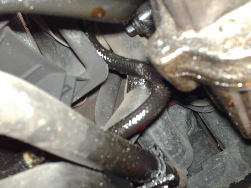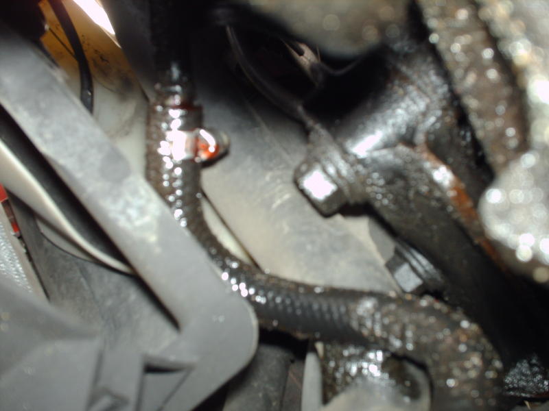 pics 4 and 5 are looking down into engine compartment...line on the left is the one the leaky hose is attatched to below...it comes up and goes into the nut right there in the middle of pic 5.