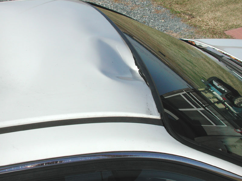 Last week, some slimeball took a baseball bat to some cars in the parking lot of my granddaughters apartment complex. Her 95 Civic 4 door LX was one of the victims. He broke the windshield and did some serious damage to the roof. The worst hit was right at the windshield/roof joint on the passenger side of the car. I'm thinking the roof panel will need to be replaced as I'm not sure I could fix it properly. There are also some "oil can" type dents in the center of the panel that won't stay popped out. A slight bit of pressure and they become large depressions again. My son-in-law had the windshield replaced so she could drive the car but I think that's going to cause complications while trying to fix the roof. I hopefully attached 2 pics of the damage.