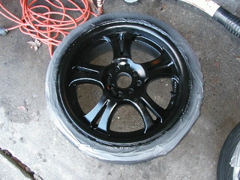 Anyhow, I am just taking a break right now. Takes about 1/2 hour per rim to blast all the paint off. Actually I am in-between coats of primer for 2 rims right now. Just letting them dry. Got 1 rim that I am taping up for paint, and 1 unblasted rim. At this rate I will be done today, and hopyfully around 4pm the rims will be back on the car