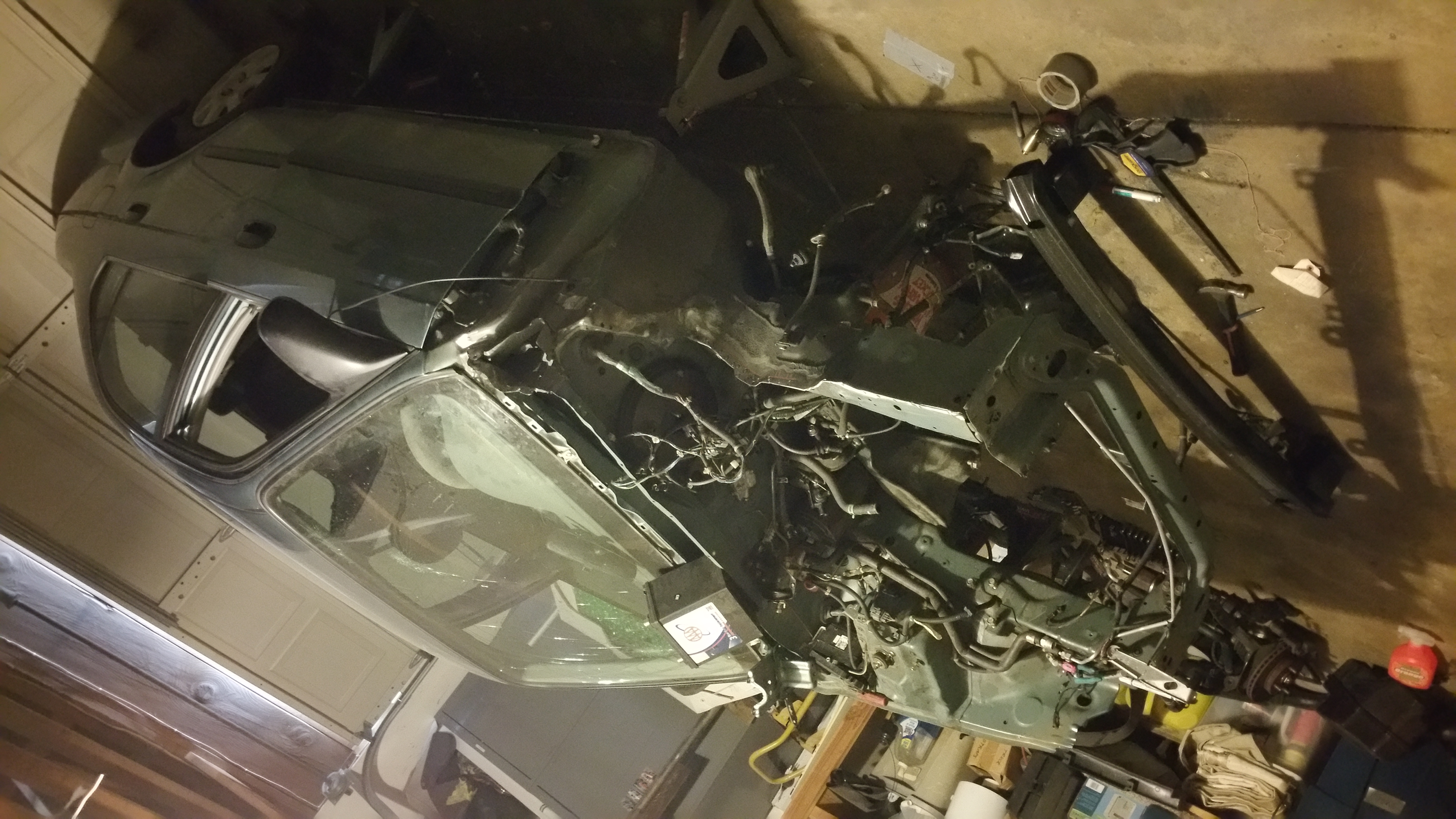 the driver side got pretty crunched up and the shock tower and other body support parts got mangled, the frame rail seems good and straight.