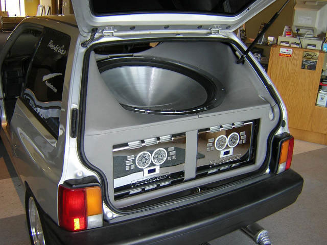 it probly sounds like crap without a doubt, there isnt enough cubic area beneath the sub to make it sound good and theres not enough room in the car for the bass to bounce off of, amd it probly takes 10 batteries to power the amps for that thing and then the car itself probly cant supply the power from the alternator to keep the car running at the same time the music is blasting the intersection
